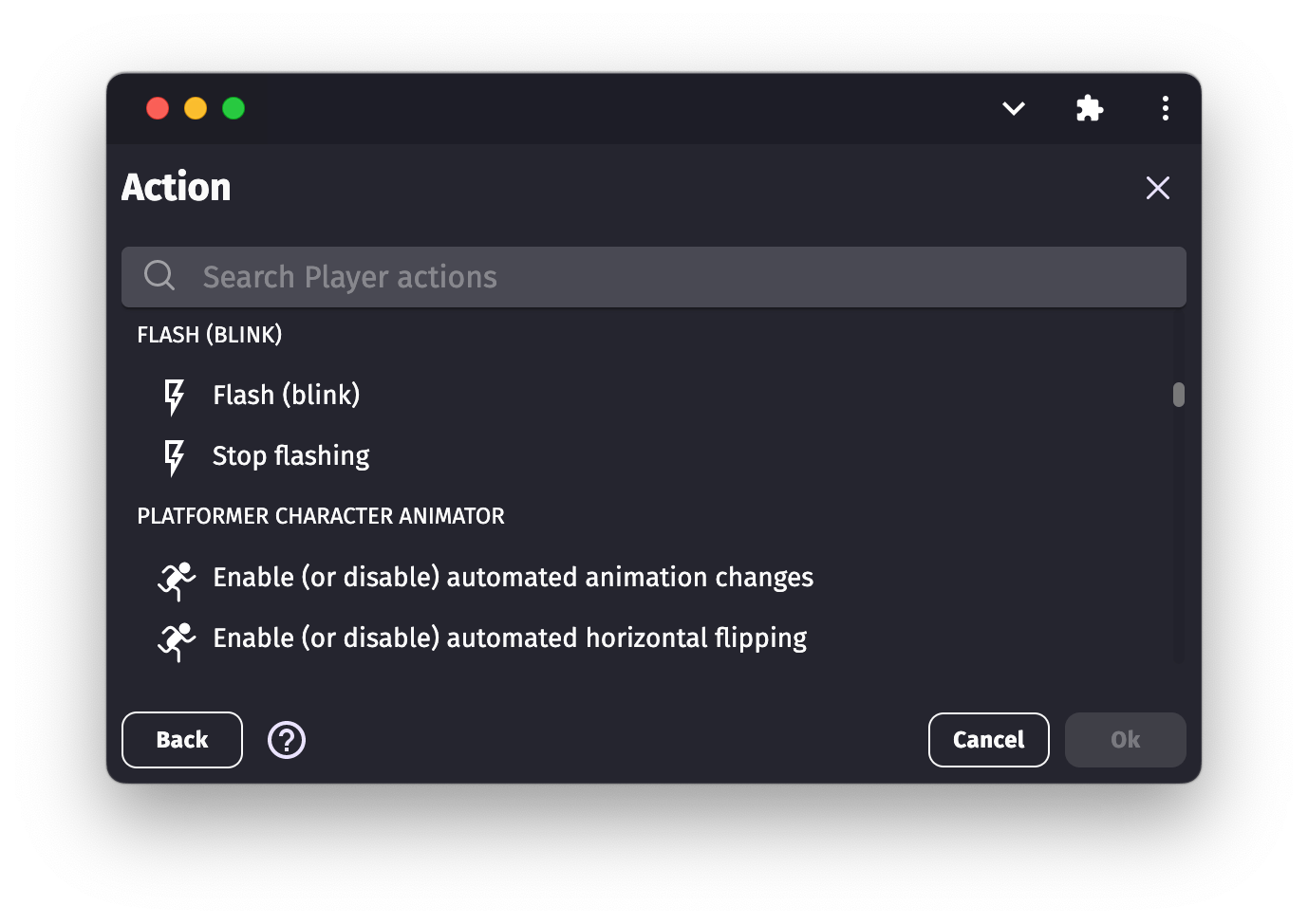 • Even if no behavior is provided, you'll have some actions or conditions. Find them in the list of actions or conditions when editing an event. The name of the category containing them is the same as the extension.