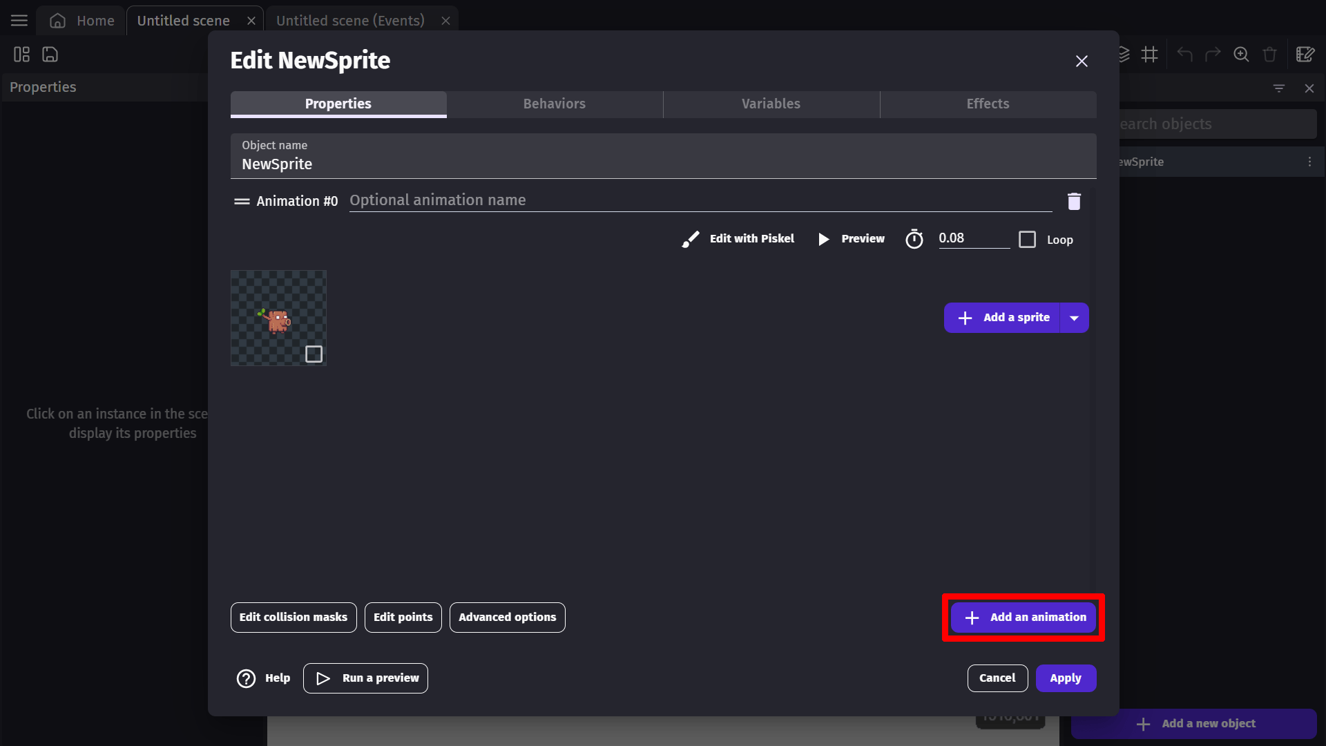 An animation allows you to add an image or series of images to the sprite object. To add an animation, click the Add an animation button.
