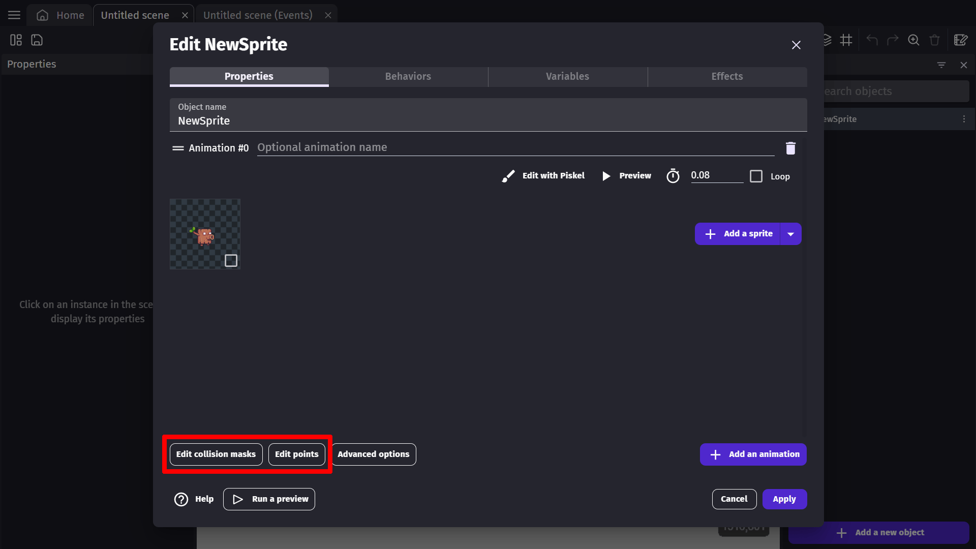 This selection will open up the sprite object properties window. In this window, you will see a few properties of the sprite object.