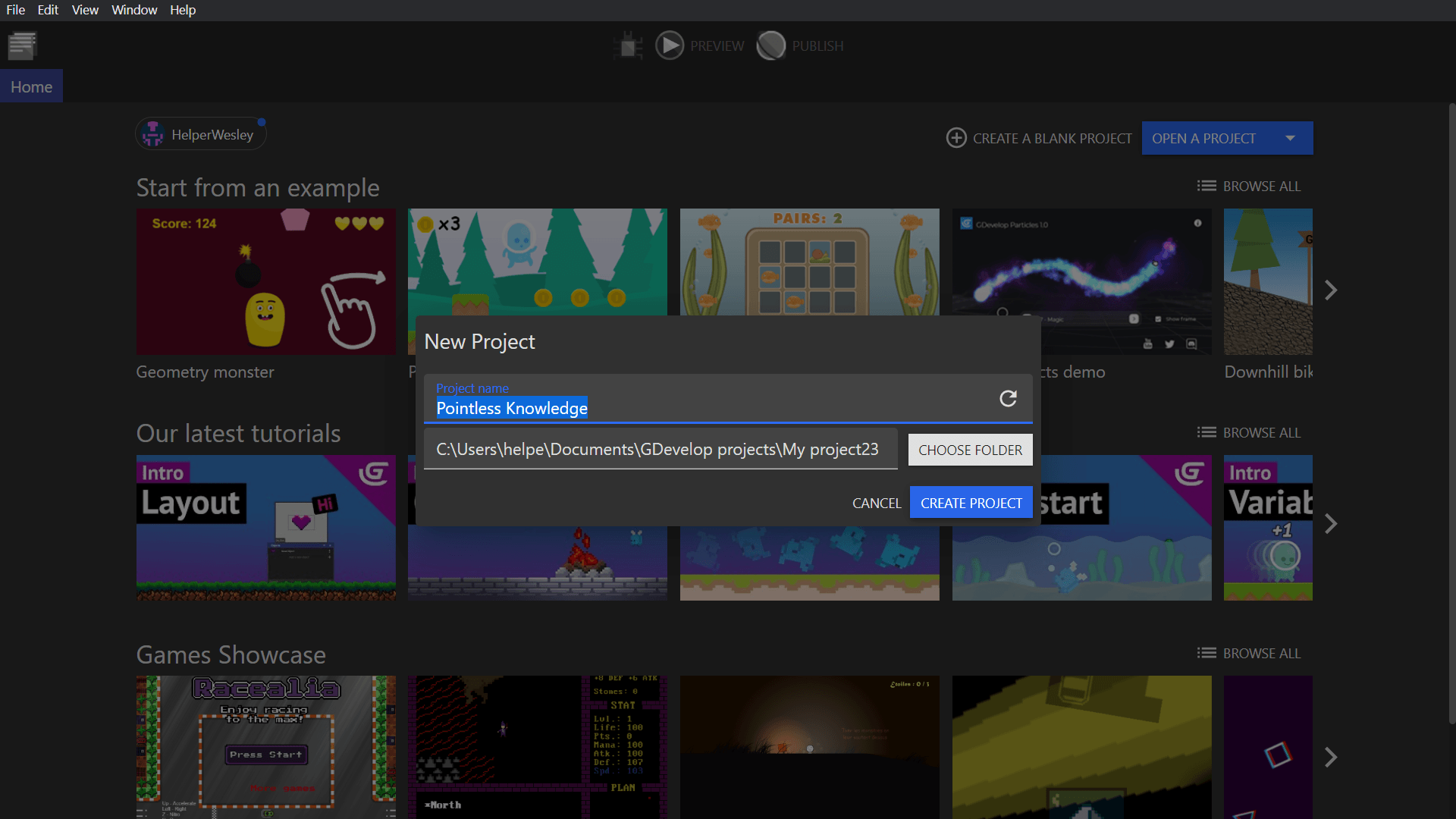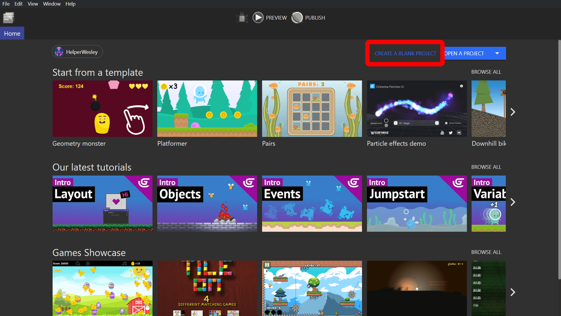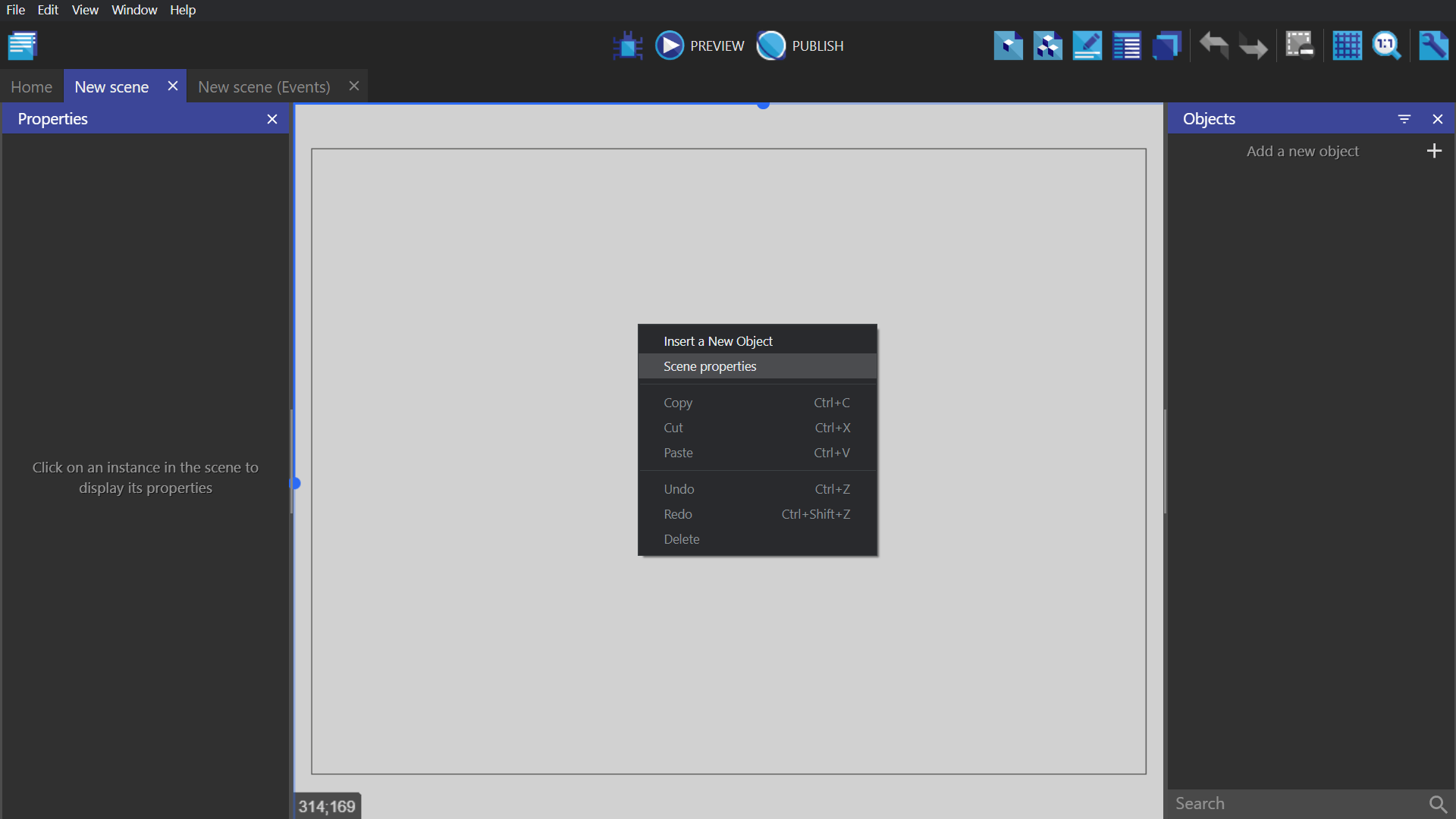 Add a scene by pressing on the highlighted button in the image below. Right click on that scene to rename it. Then left click on the scene to open it.