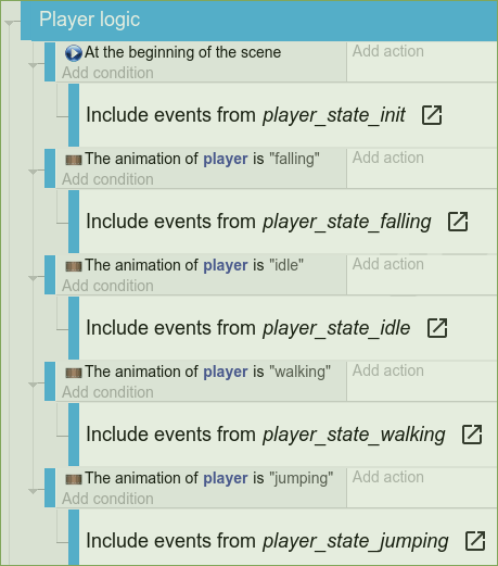 Switch to the event editor (“main” scene) and create these external events “playerstateinit”, “playerstatefalling”, “playerstateidle”, “playerstatewalking”, “playerstatejumping”. In the events of your main scene create a new event group from the drop-down menu on the right-hand side. Name it “Player logic”. Now add a "At the beginning of the scene" condition. Add a sub-event to the condition and link in the external event sheet “playerstateinit” via the “add”/”other” button. Do the same for all the other player states.