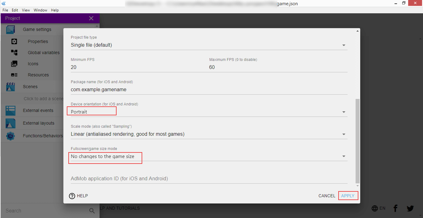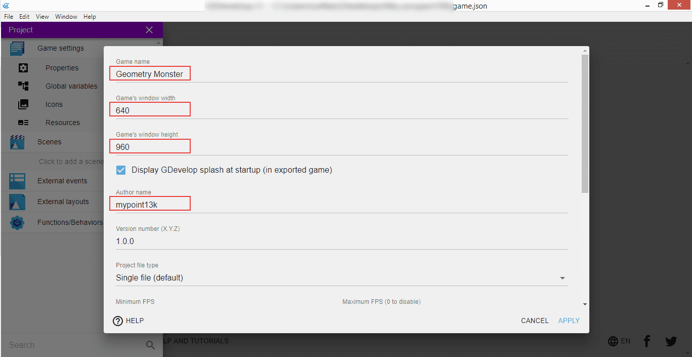 Our game's name is "Geometry Monster, window size is 640 pixels wide and 960 pixels high - this will create a gameplay area that suits the portrait mode on a mobile device which we will confirm in a second. You can enter your name or nick in the "Author" field below.