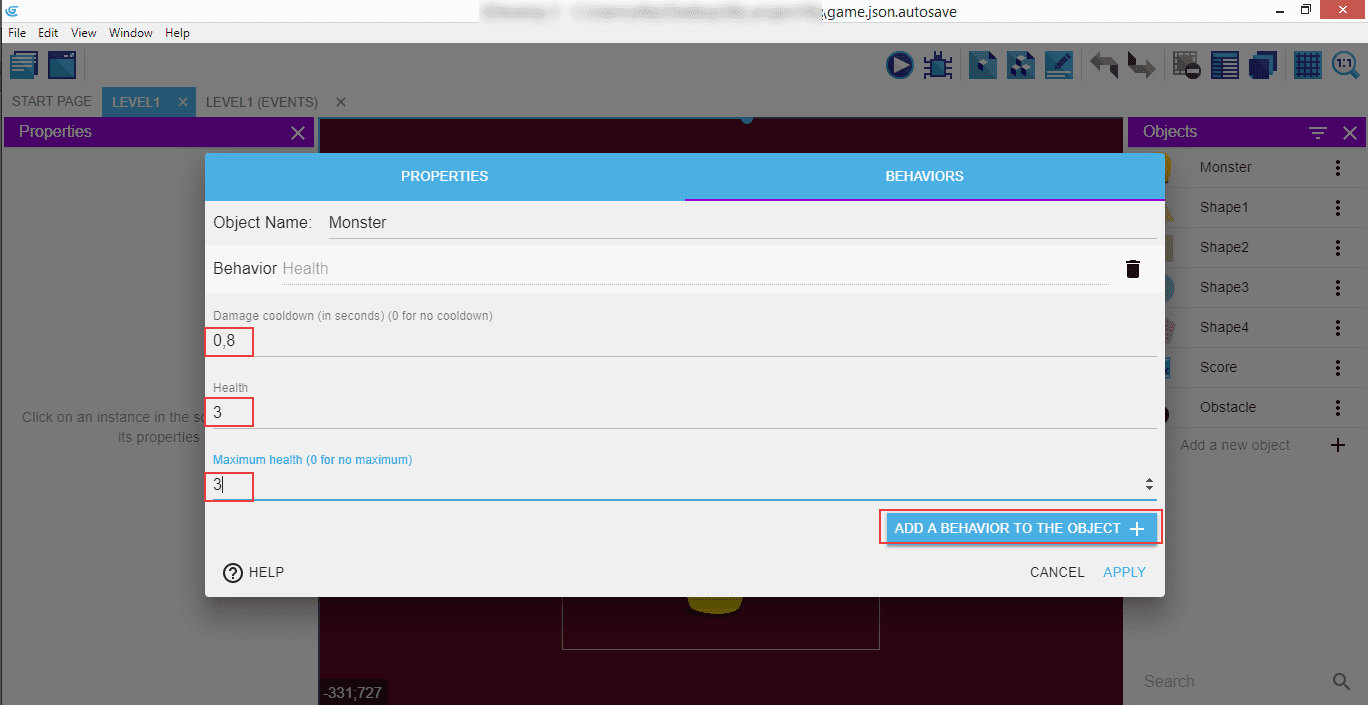 The "Half period" means the time when the object is invisible, and we're going to set it to 0,1 seconds. Below that, you can see the "Health" behavior we entered previously. Click "Apply" to have them saved.