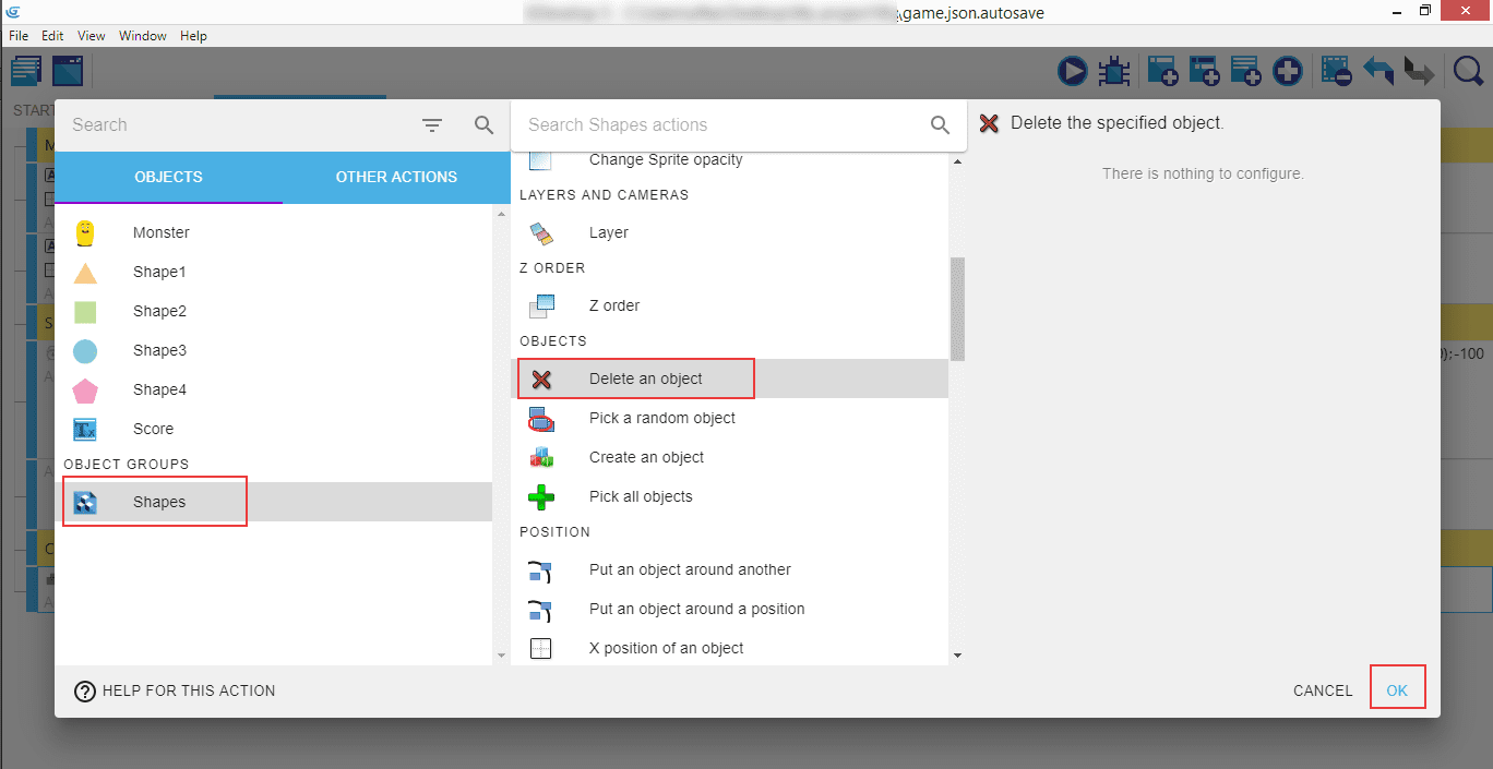 As always, make sure "Shapes" are selected, then look for "Collision" (which will test the collision between two objects). In the right panel enter the "Monster" and click "Ok".