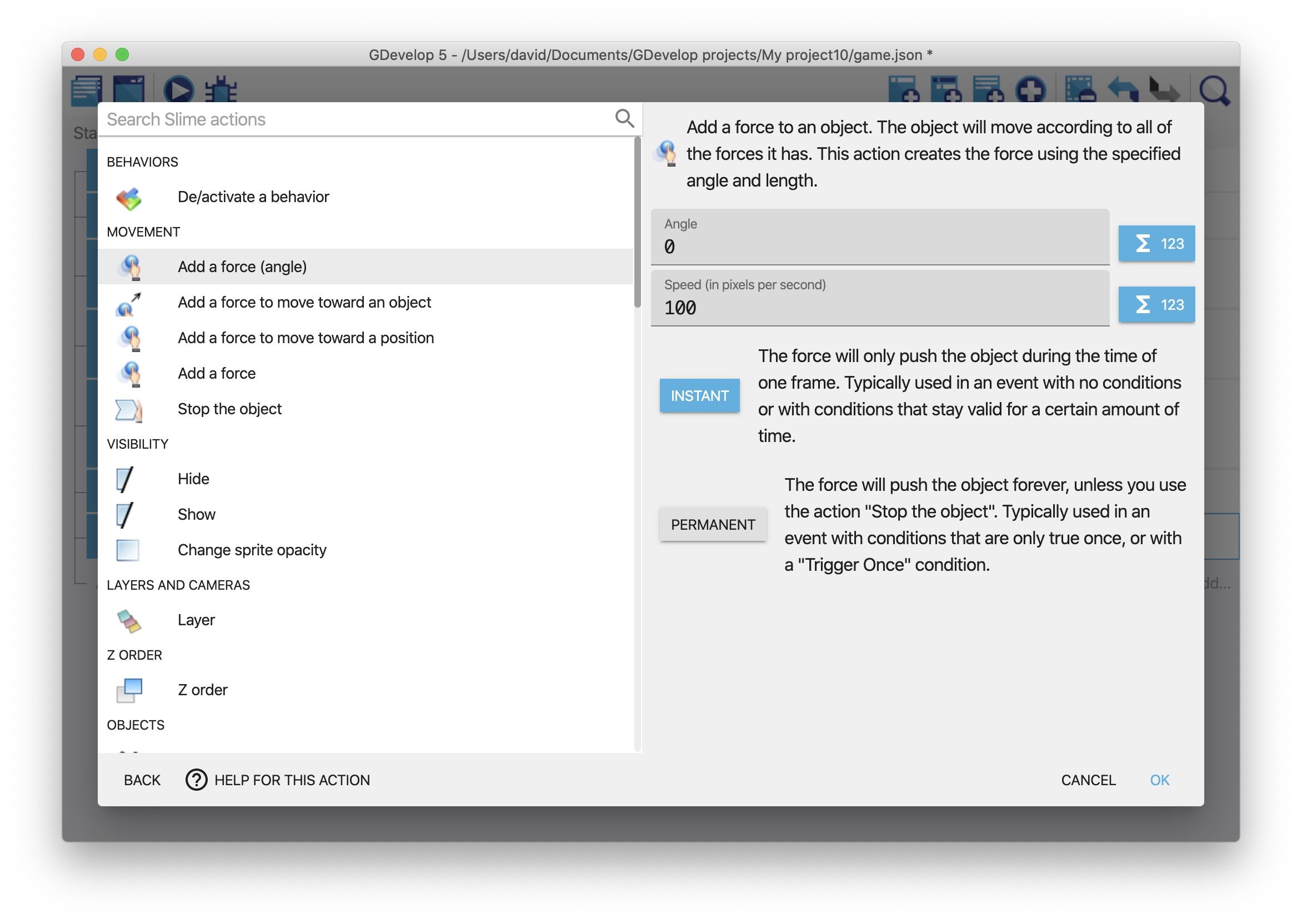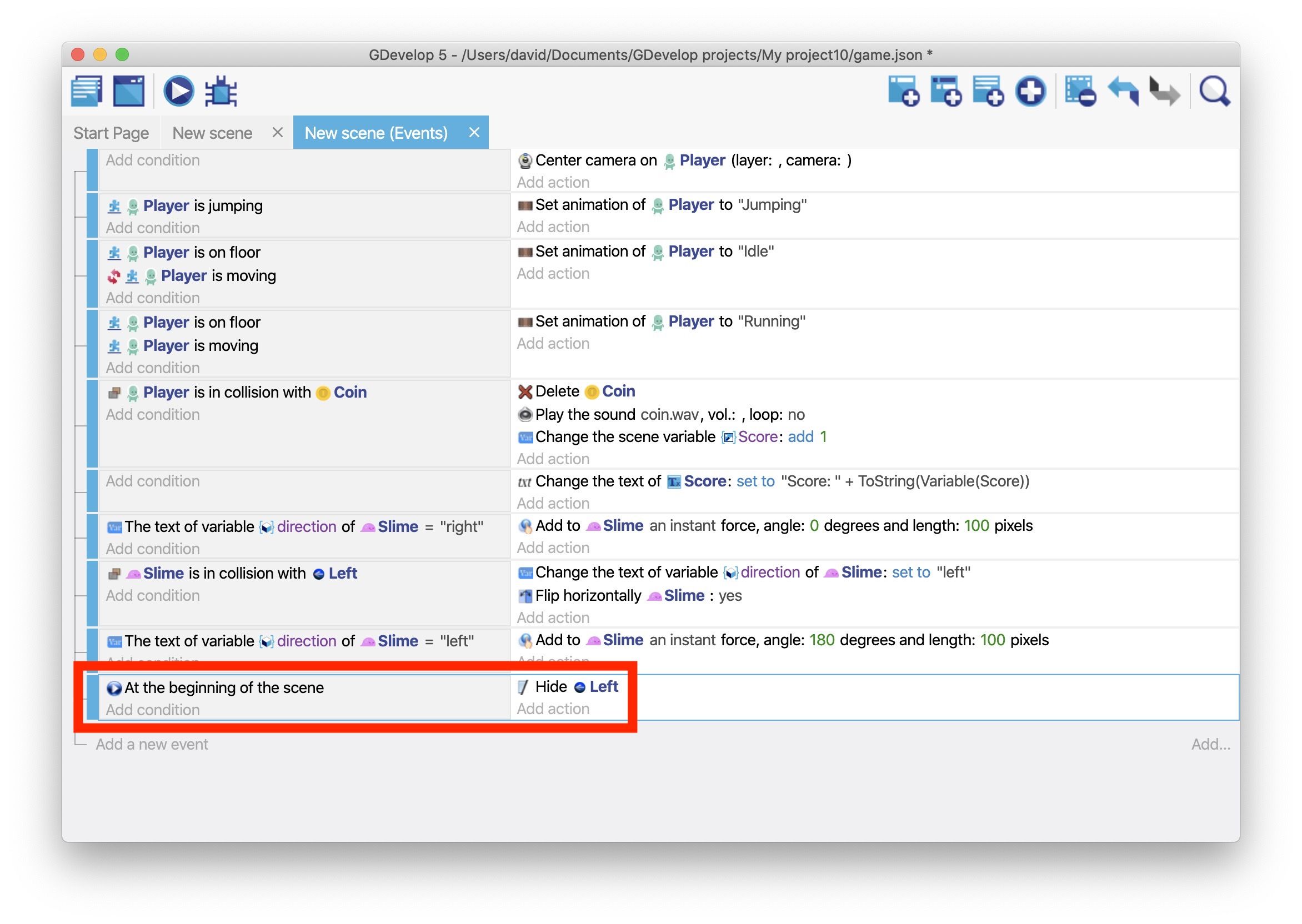 2. Add a Collision condition that checks if the "Slime" object is colliding with the "Left" object.