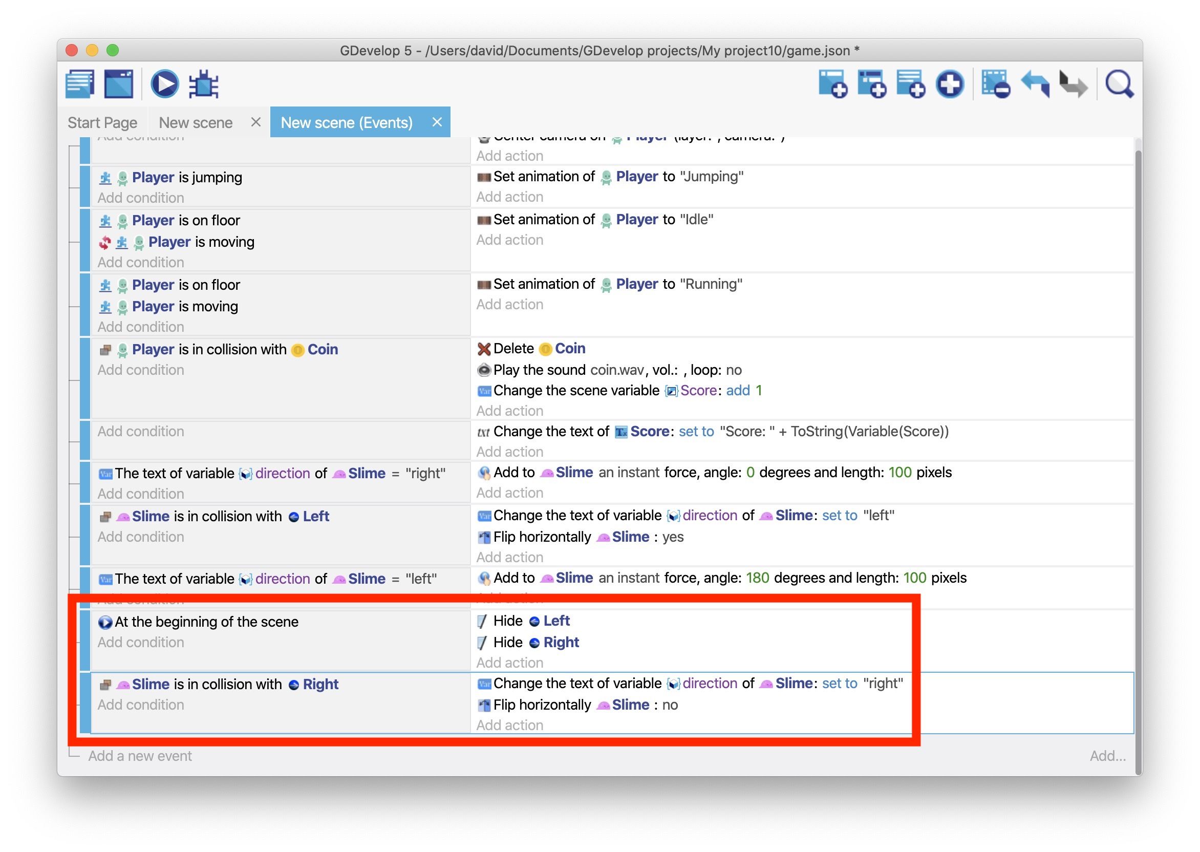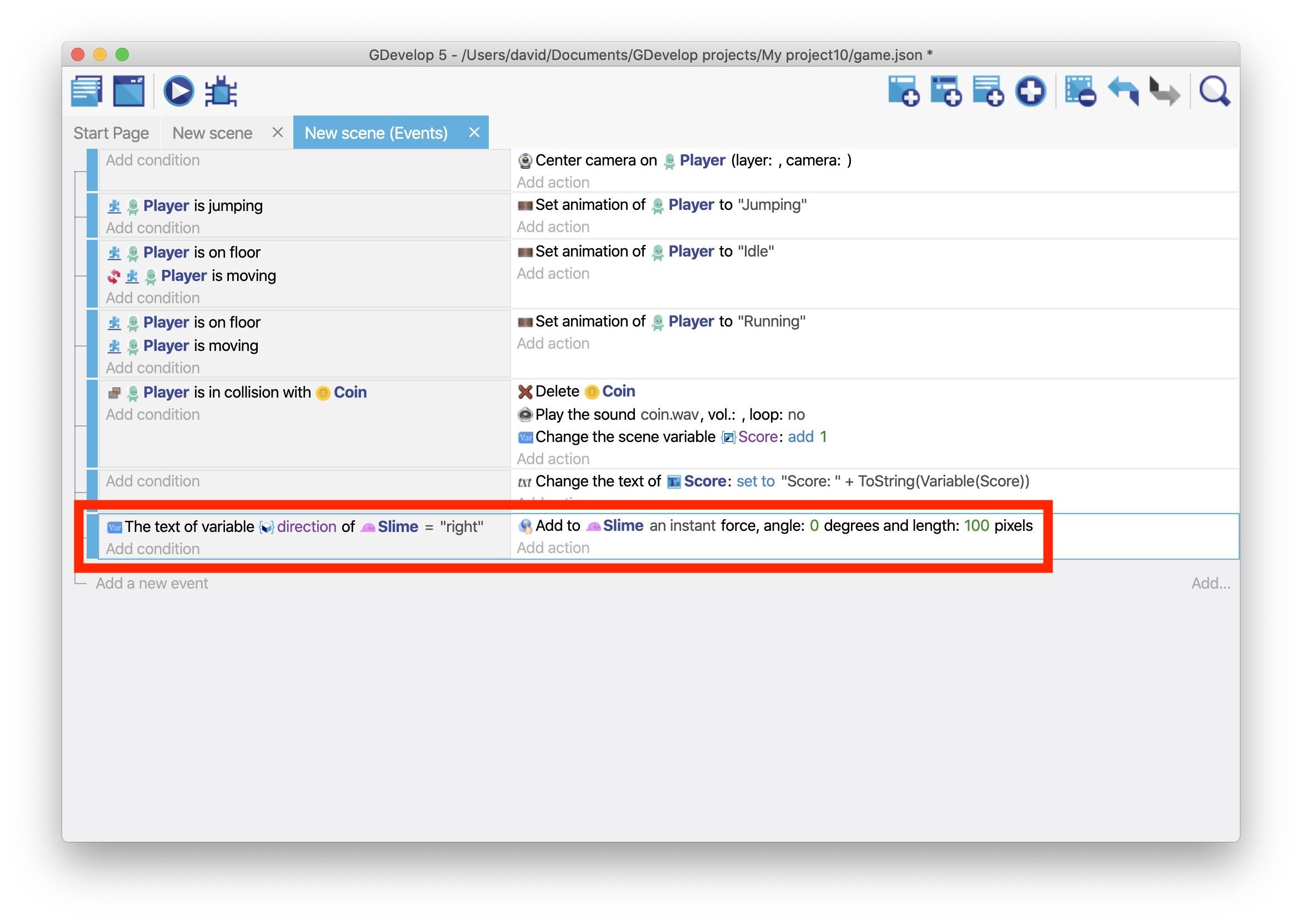 • When the "Player" object collides with the "Slime" object, set the "direction" variable to "right".