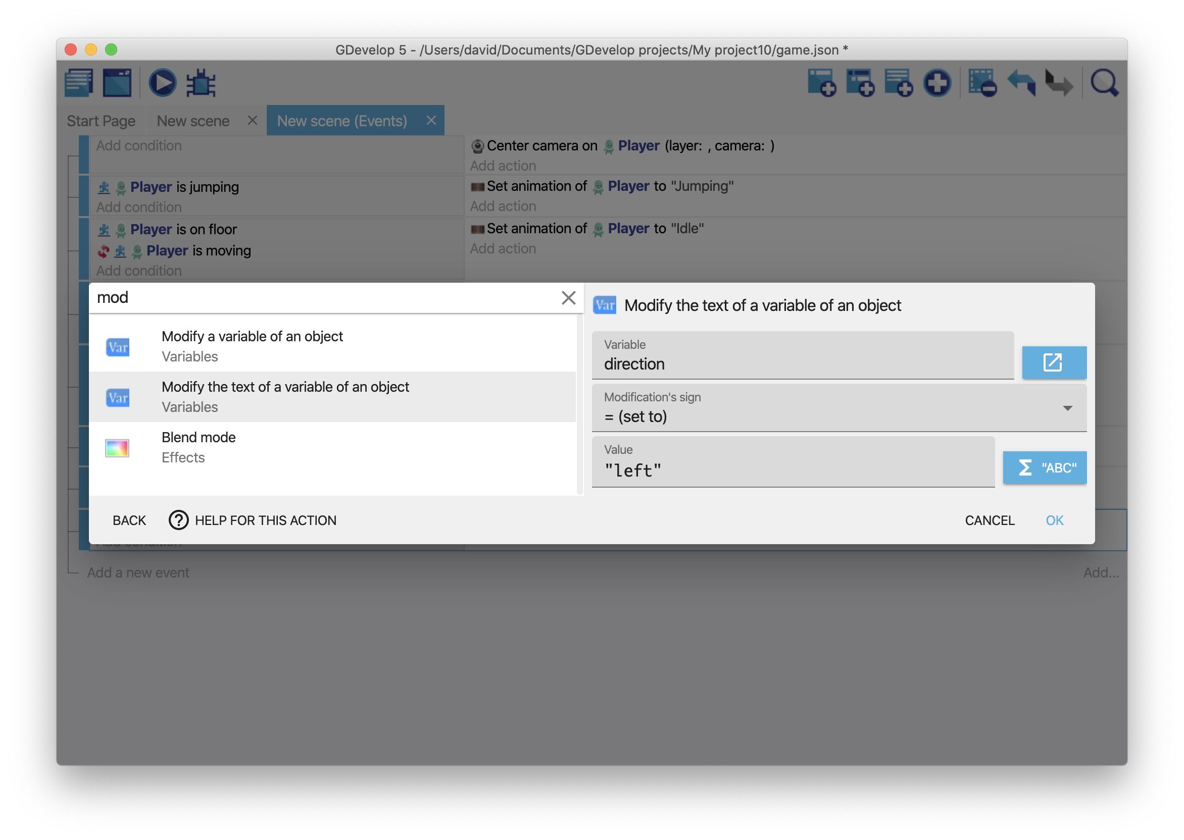 3. Add a variable named "direction" with a value of "right". This is the default value of the variable.
