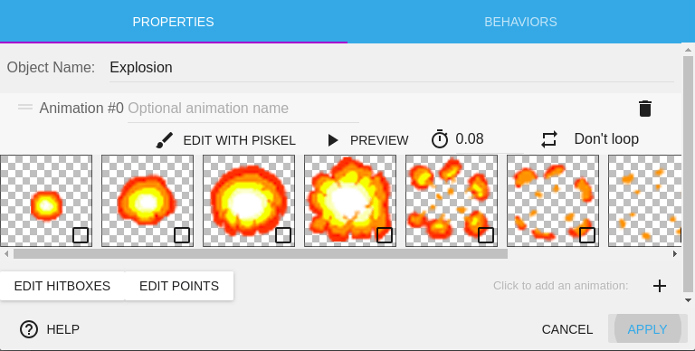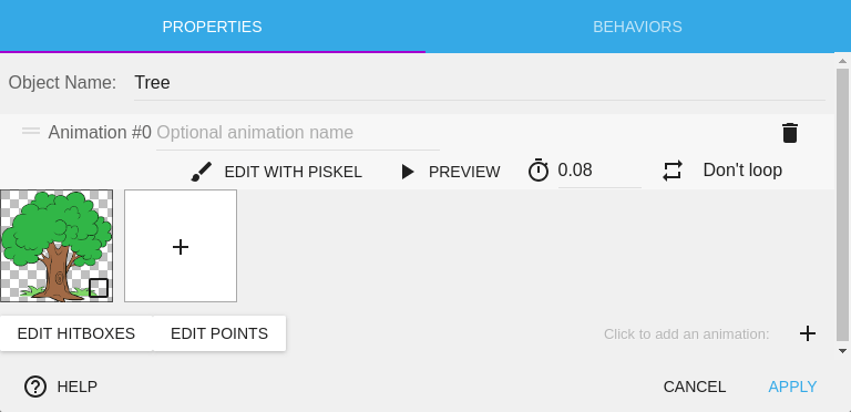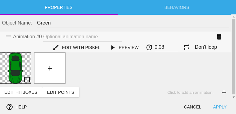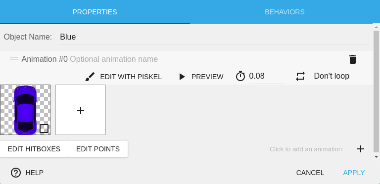 Let's add an animation to the object. Animations are containing images that are displayed on screen for Sprite objects.