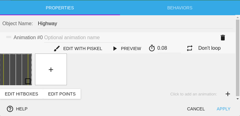 Similarly, add a new Sprite object Highway which consists of the image 'highway.png' as the animation.