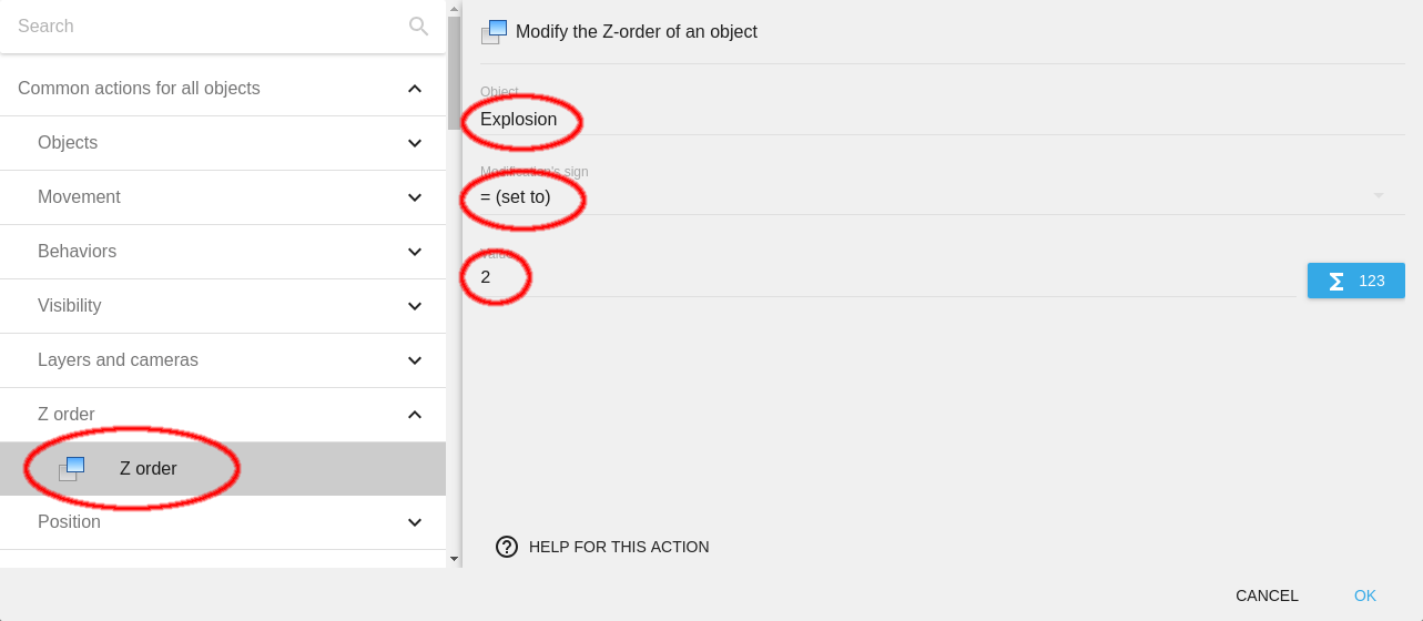 • To make the Explosion visible, add an event to set the Z Order of the object Explosion so that it is higher than that of the Highway