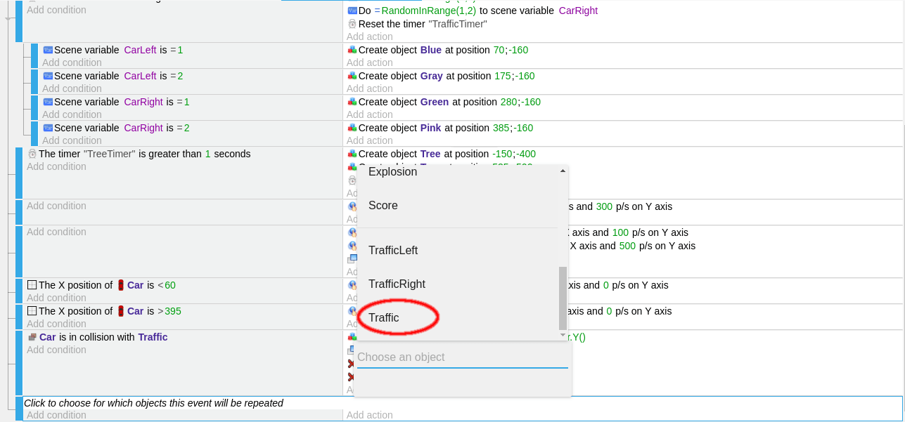 To solve this problem as well as to optimize the game by freeing up memory, we will add another action to the event which will delete the object Traffic.