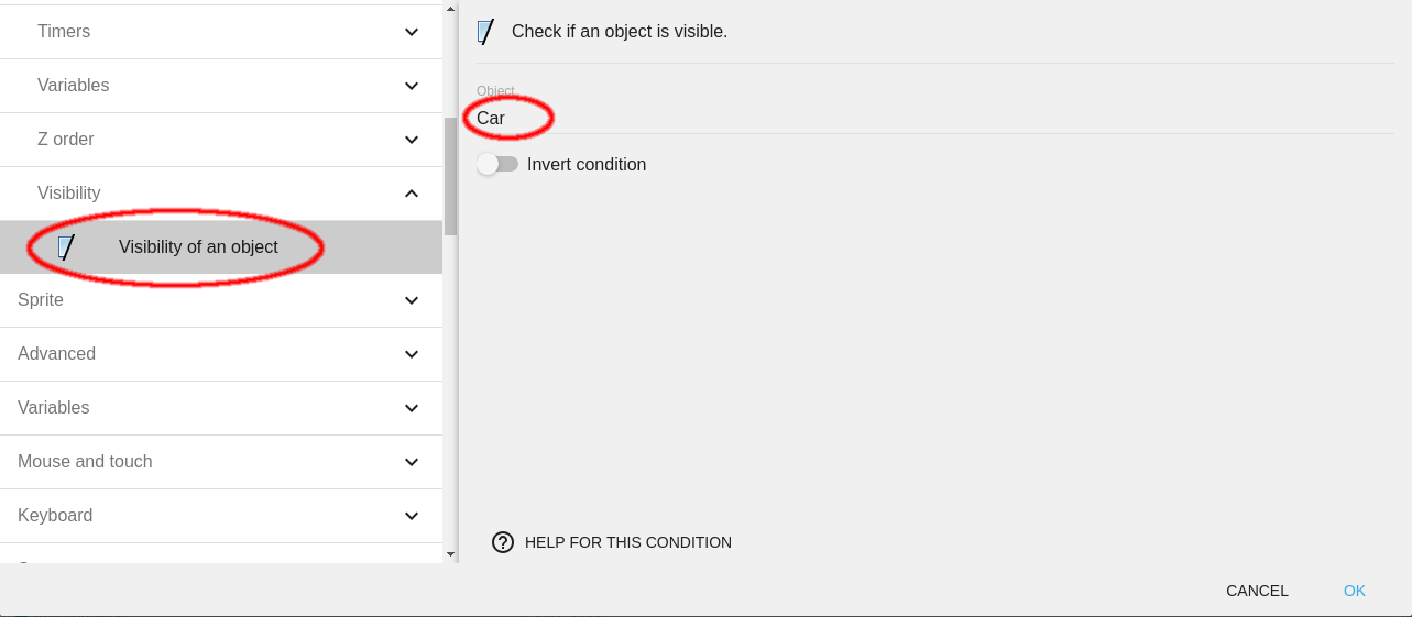 In the condition of the sub-event, we will check if the value of CarLeft is equal to 1. To do this, we will add the Value of a scene variable condition. Enter the variable name CarLeft in the Variable field, set the Sign of the test to = (equal to) and fill '1' in the Value to compare field.