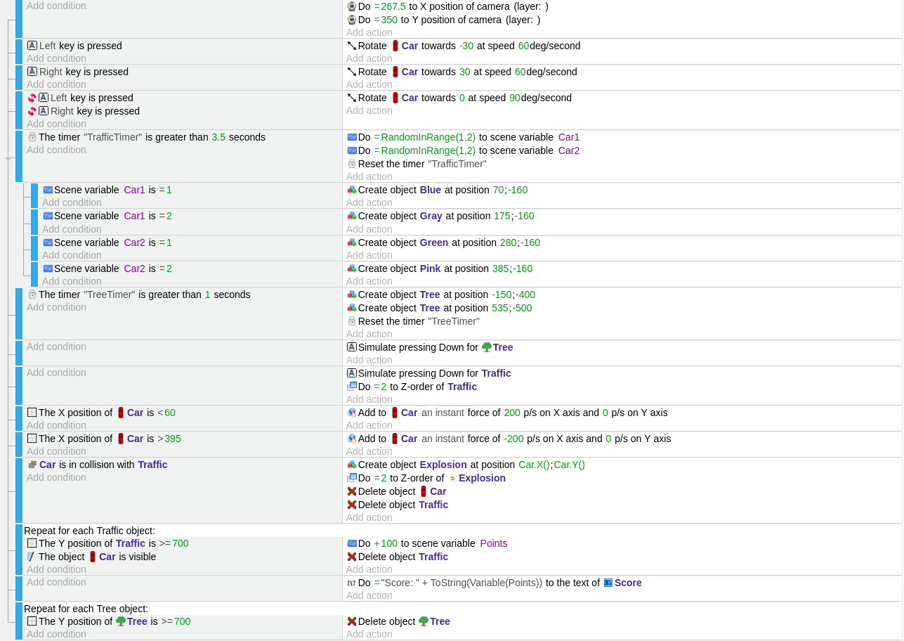 To display the score, we will make an event such that when any object in the group Traffic passes a predefined position, the value of the score is updated. To do this, we need to use the help of a scene variable.
