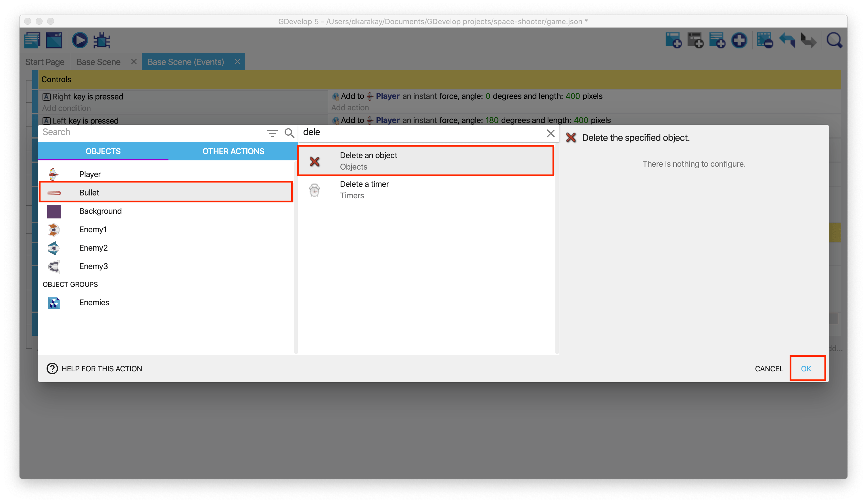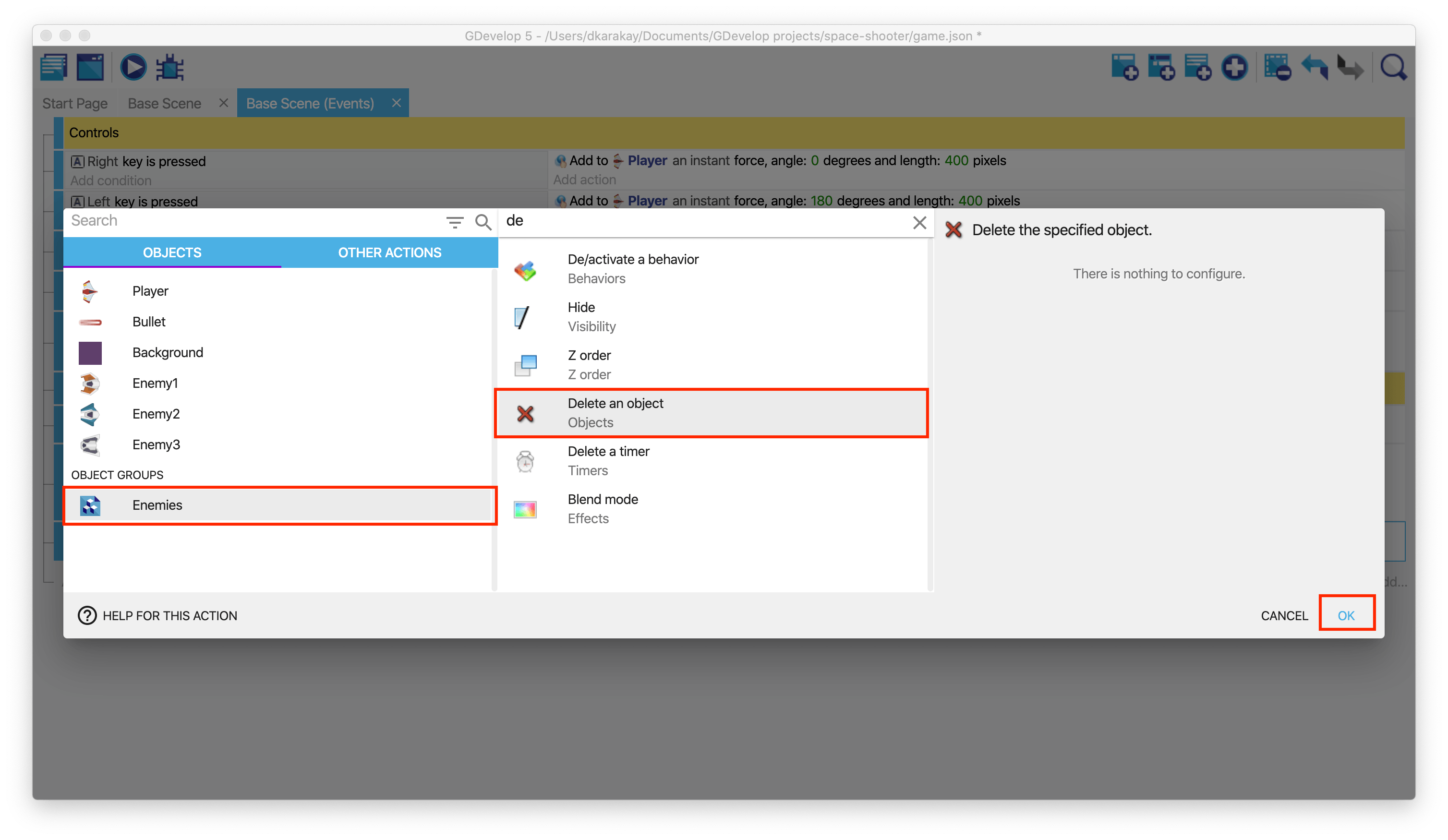 If the enemy is dead, we should delete the scene's object. We will add a new action to delete the object, just like in the previous steps.
