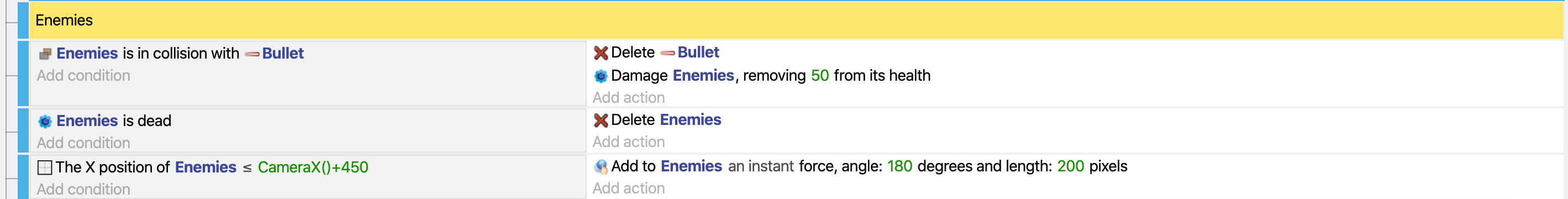 Add the delete action for the enemies like in the above. Then, your actions look like in the image below.