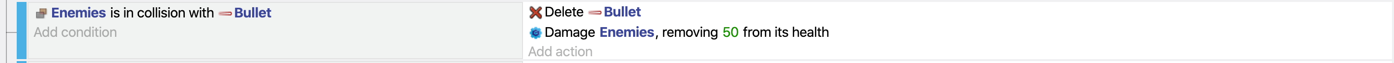 If the collision happens between bullets and enemies, we need to remove the Bullet objects. Hence, we will add a new action next to the previous condition. Pick Bullet object and select Delete an object.